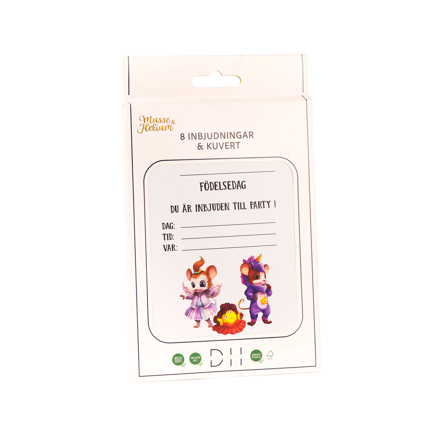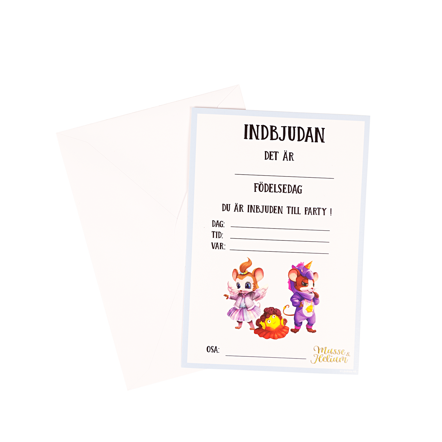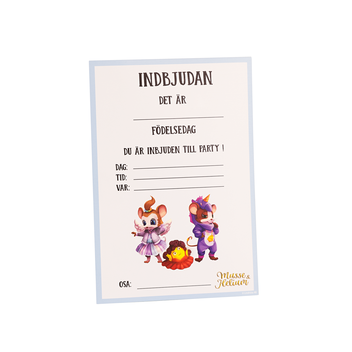 8st inbjudningskort med motiv av Camilla Brincks Musse & Helium.