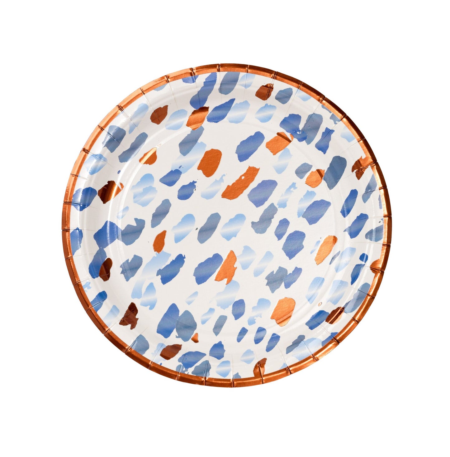 Tallrikar i papper. Penseldrag i flera blå nyanser dekorerar tallriken inklusive koppardetaljer. Kopparkant runtom tallrikskanten.
